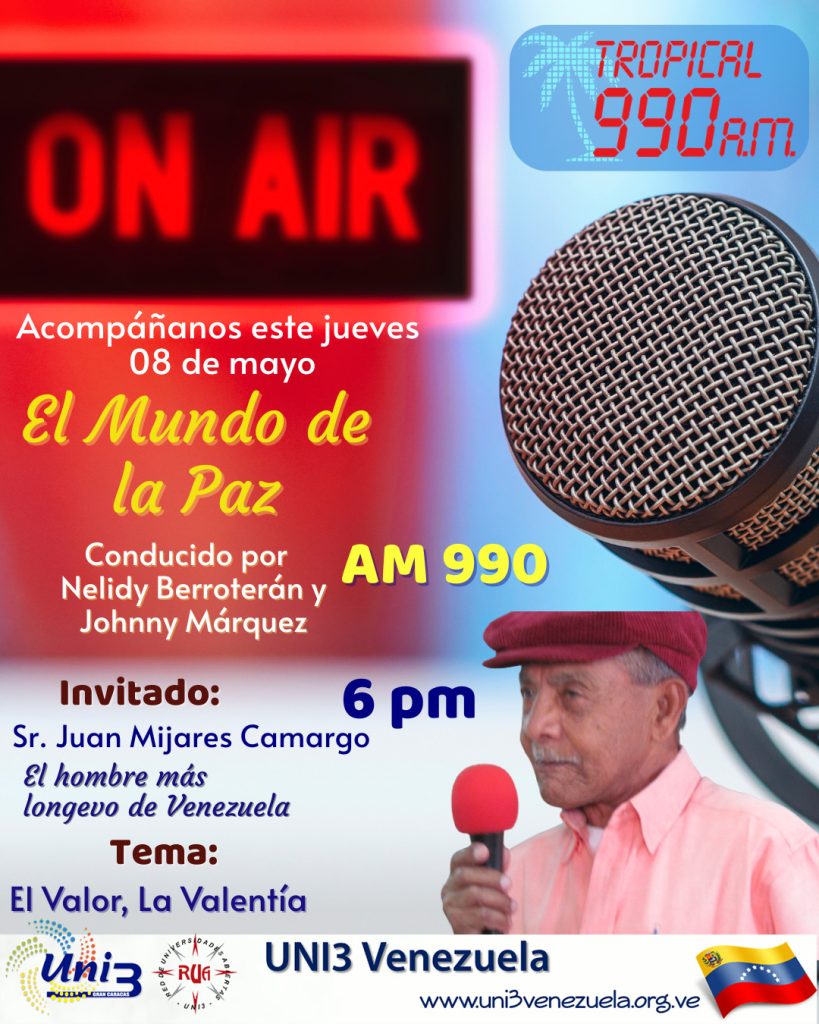 El 08 de mayo, por la Emisora Radio Tropical, nuestro querido Juan Mijares fue entrevistado por la talentosa Nelidy Berroteran en el programa EL MUNDO DE LA PAZ, trataron distintos temas: el valor, la valentía, entre otros y Juan con su bagaje de conocimientos, su experiencia, excelente memoria y sus dotes de buen conversador, nos deleitó e hizo que el tiempo se hiciera corto. Gracias Juan, cada día nos sentimos más orgullosos de ti.