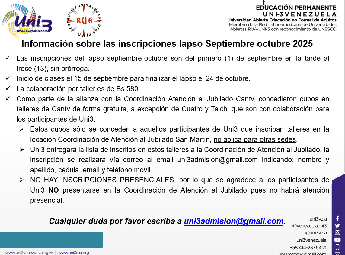 Hola , buenos días. Ahora es que estoy viendo la información, fuí participante en la sede del centro, quisiera incorporarme, pero si es posible enviar teléfonos o correo de UNI3 A,mi correo electrónico. mirtha.hernandez12@gmail.com agradecería se me considerará para la incorporación. Saludos y bendiciones