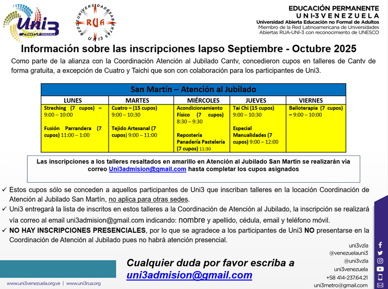 el periodo de inscripciones comenzó esta semana hasta el 7 de agosto, en el siguiente enlace se puede informar de la oferta de talleres https://bit.ly/uni3inscripciones , la esperamos